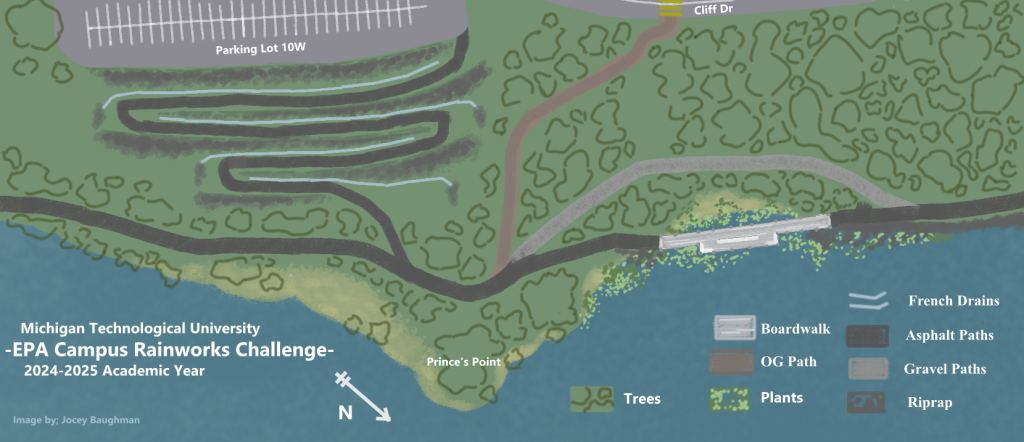 The EPA Campus Rainworks team’s goal is to incorporate green infrastructure and sustainable practices into the MTU campus. The team has chosen the area surrounding the new Lot 26 as the region of campus to focus on. The team has met with a professional contact and is working toward an improvement design! The official EPA challenge has been canceled due to a lack of funding. Still, this year’s team is committed to upholding the expectations and values of the design process to have a meaningful year of learning and advancement.